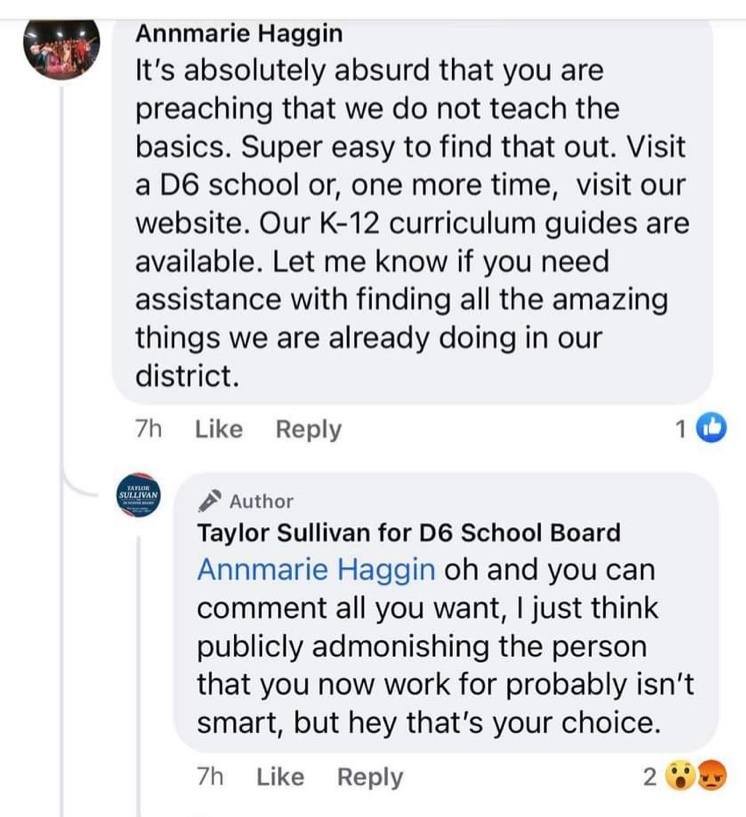 The page belonging to Taylor Sullivan has since been taken down, and Sullivan issued a statement on the posts written by an administrator of “Taylor Sullivan for D6 School Board.”