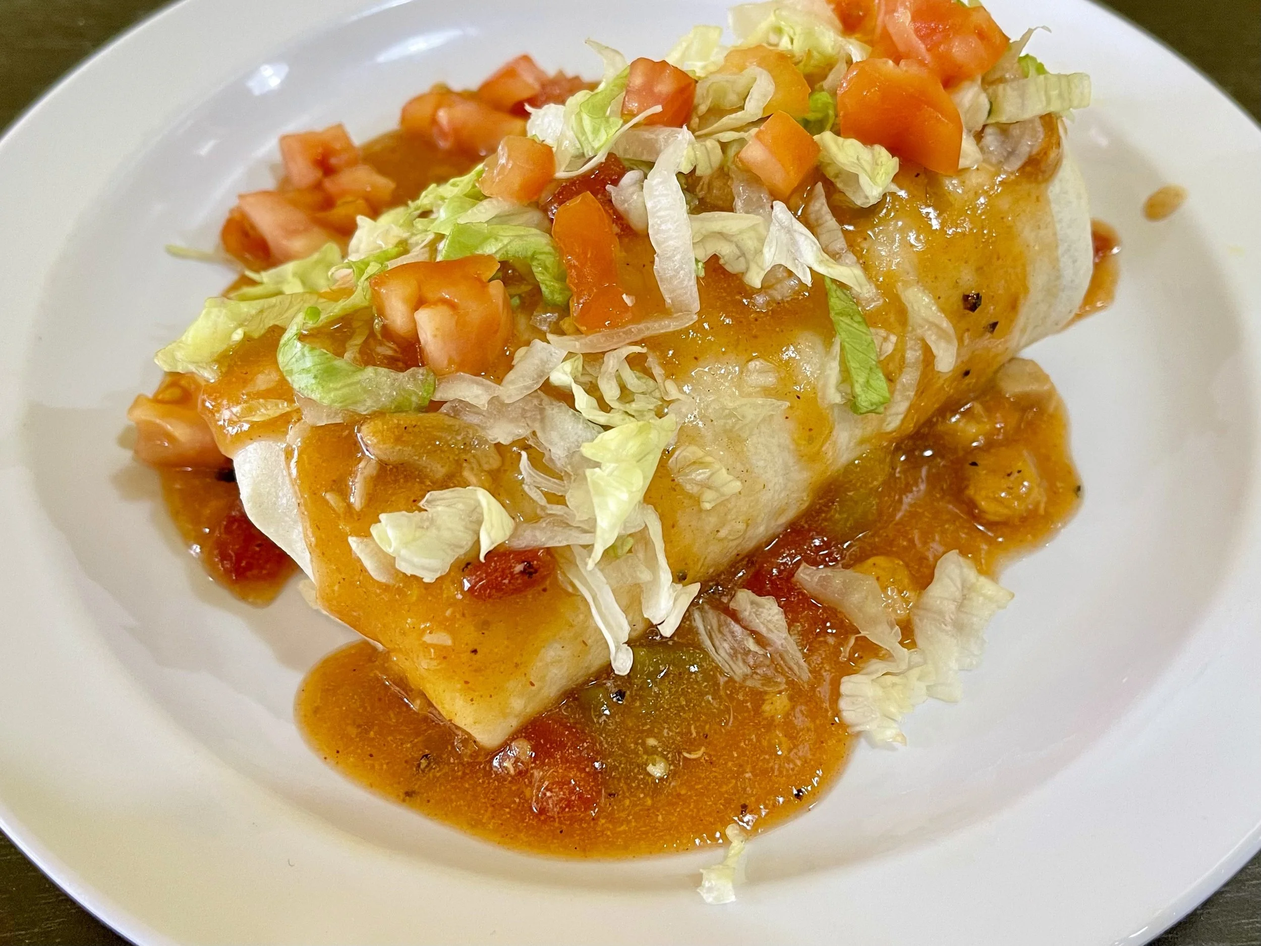A breakfast burrito smothered with green chili at Klutzy’s was first known as the “Tuck-n-Roll”, an homage to Ashley Marcus’s years as a gymnast. Photo Emily Kemme.