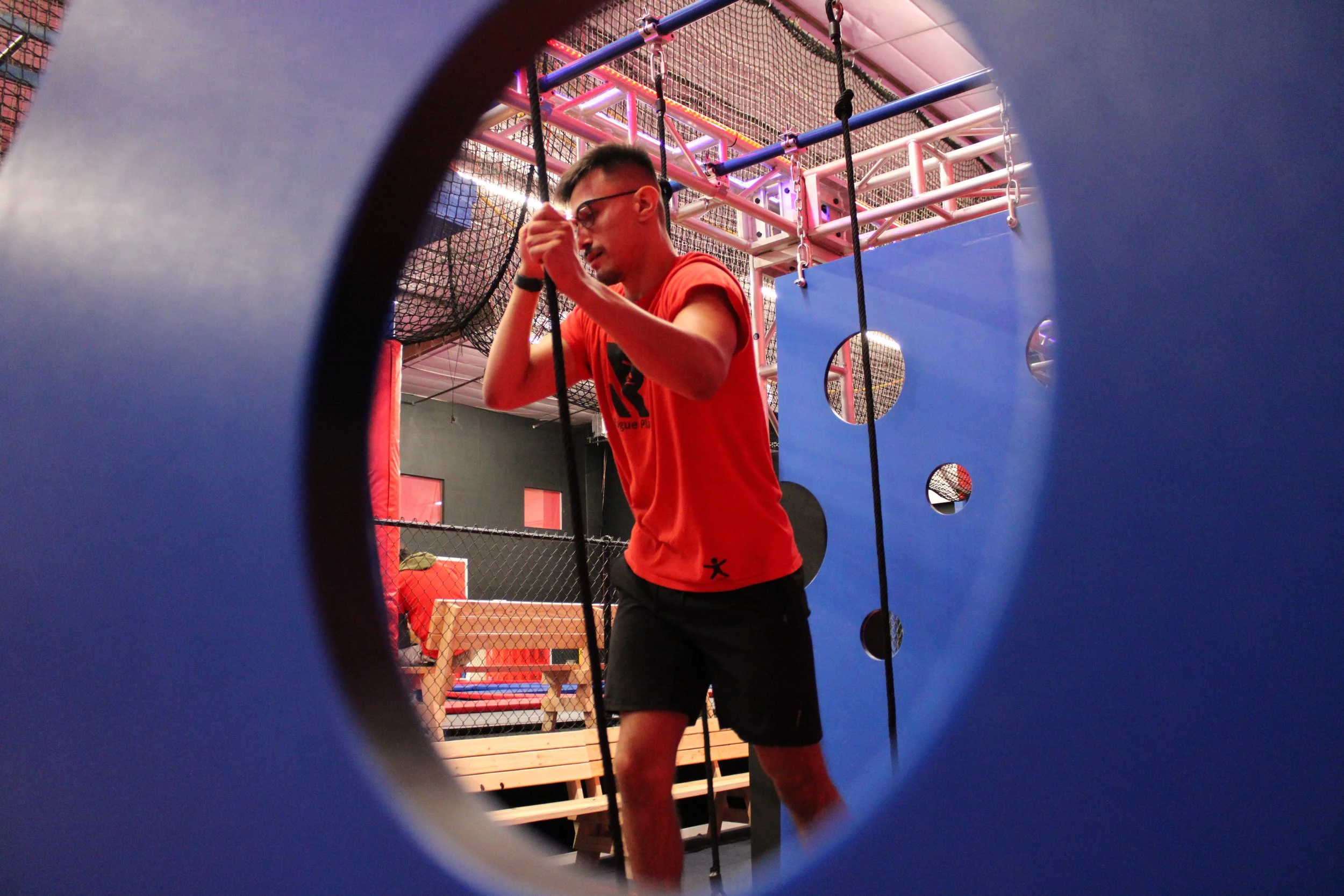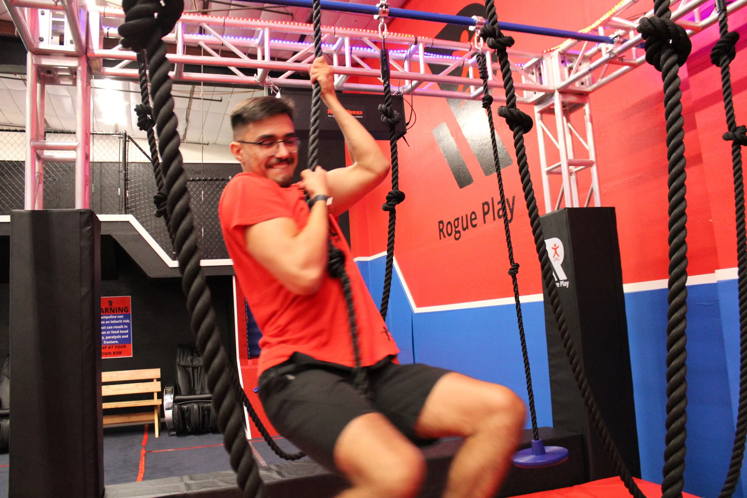 Josiah Mudrow, manager at Rogue Play, demonstrates how to move through the ninja obstacle course. Photo by Kelly Ragan.