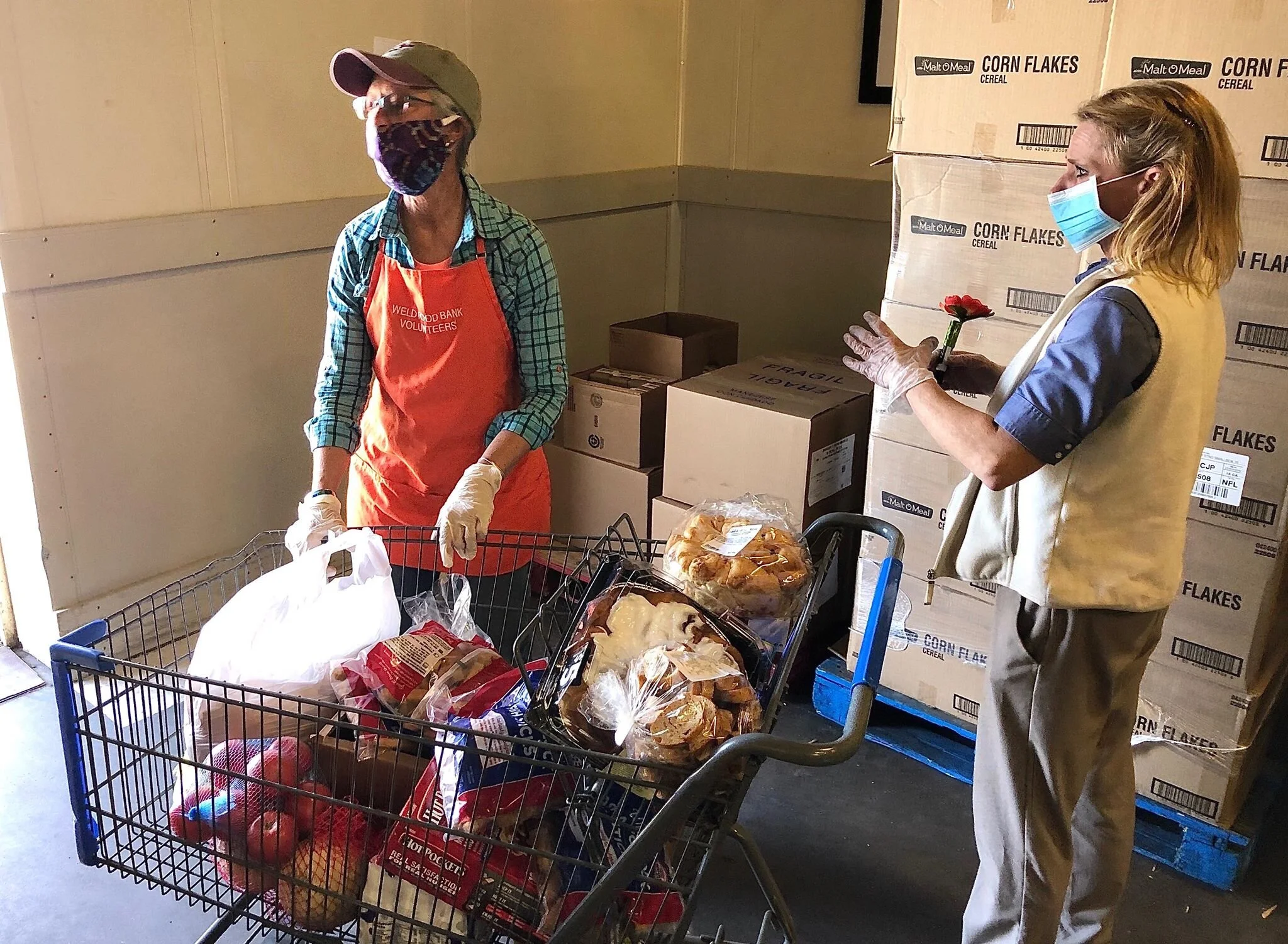 A few minutes before noon on Monday, the traditional time for lunch, volunteers were flying around like the worker bees they’ve had to be for a month preparing emergency food kits. They call them “boxes,” but there’s enough produce and other food to fill a cart. A steady line of cars waited.